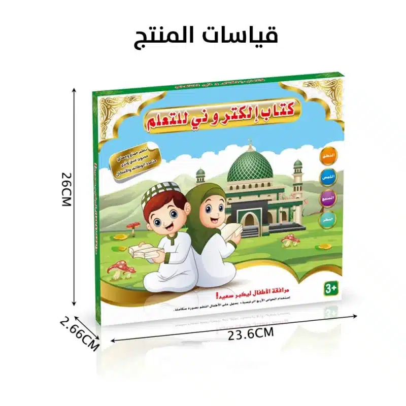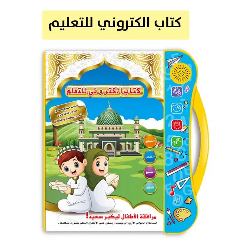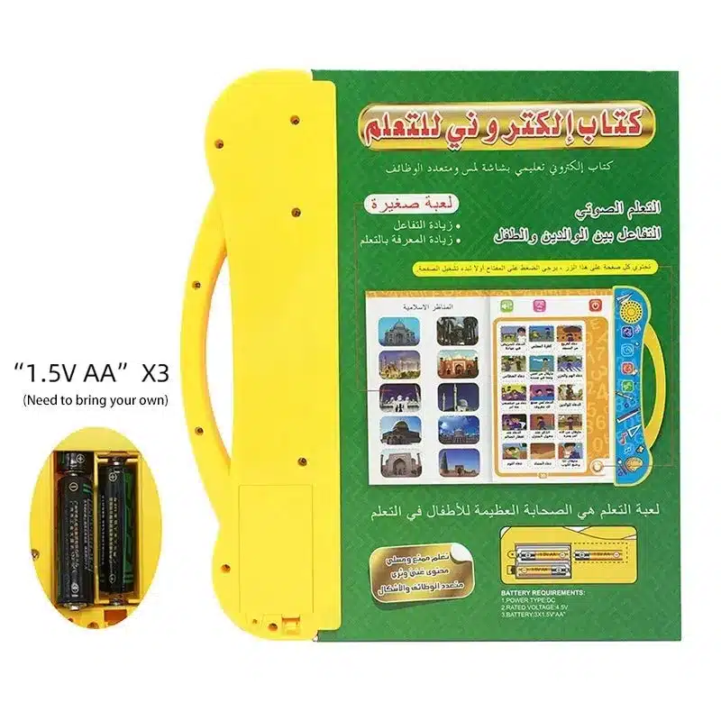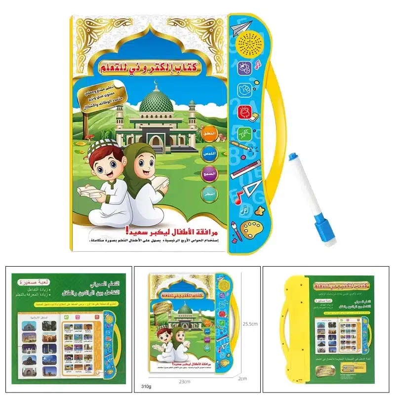 Livre électronique islamique éducatif bilingue arabe-anglais pour enfants. Enseigne les 5 piliers de l’Islam, prière, jeûne, bonnes manières avec audio interactif et illustrations de mosquées. Boutons thématiques colorés, nasheeds éducatifs et stylo pointeur inclus. Pages plastifiées durables. Fonctionne avec 3 piles AA. Idéal dès 3 ans pour l’éducation religieuse ludique.
